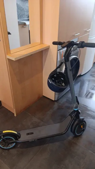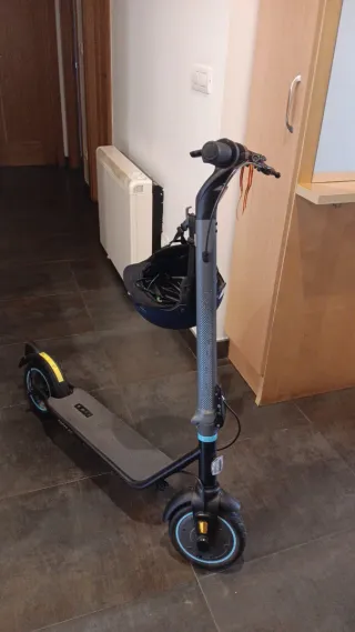 Patinete eléctrico en color negro, ideal para desplazamientos urbanos. Incluye casco y cargador original - Diseño moderno y funcional. - Ruedas con detalles en azul. - Guardabarros trasero con detalle amarillo.