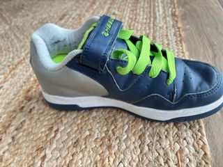Zapatillas deportivas con ruedas marca Heelys, ideales para deslizarse. - Talla 35 (22cm) - Color azul marino con detalles en verde lima. - Cierre de velcro y cordones. - Suela blanca.