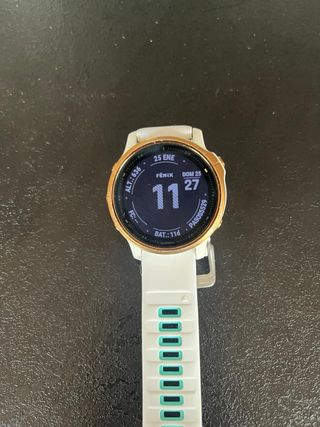 Reloj deportivo Garmin Fénix 6s Pro con correa blanca y detalles en turquesa. - Bisel dorado. - Correa de silicona. - Pantalla circular.