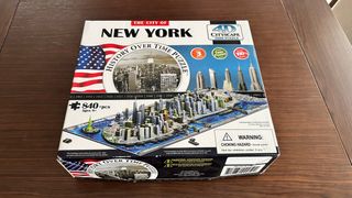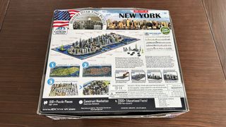 Puzzle 4D Cityscape de Nueva York, que representa la historia de la ciudad a través del tiempo. Incluye un póster. - 840+ piezas. - A partir de 8 años. - Representación detallada de edificios icónicos y el río.