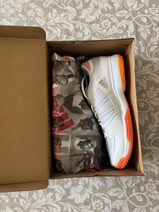 Zapatillas deportivas Adidas talla 47 1/2, ideales para tenis, pádel o frontenis. Diseñadas para ofrecer comodidad y rendimiento en la pista. - Color blanco con detalles en naranja. - Logo de Adidas en el lateral. - Suela de goma para un buen agarre. #adidas #padel #frontenis