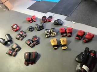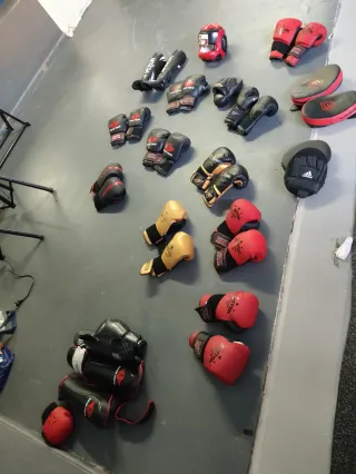 Lote de equipo para entrenamiento de boxeo o artes marciales. - Incluye guantes de boxeo de varios tamaños y colores. - Paos de entrenamiento. - Casco protector.