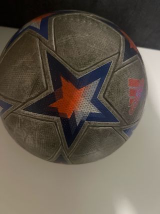 Balón de fútbol con diseño inspirado en la Womens Champions League. Presenta un acabado plateado con detalles en azul y naranja. - Diseño de estrellas. - Marca Adidas. Precio inicial 25 euros pero se puede negociar.