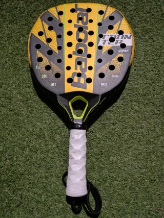 Pala de pádel Babolat Counter Viper modelo 2024. - Diseño en amarillo y negro. - Superficie con patrón de agujeros. - Grip blanco. La pala la compré la semana pasada , la he quitado el precinto , le he quitado su overgrip( q lo tengo aún ) y le he puesto un hexacore y un grip nuevo , tiene 2 juegos( 5 minutos ) y ningún roce ni arañazos ni nada . La vendo por q es redonda pero no lo redonda q quisiera La entrego otra vez con su overgrip puesto de babolat y si quieres te pongo un grip nuevo No es negociable el precio, ni lo bajo ni nada , no te molestes