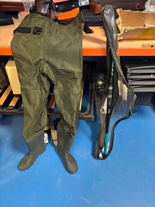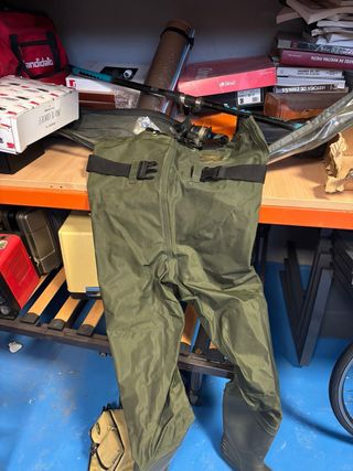 Pantalones de pesca de color verde, diseñados para mantenerte seco. - Material resistente al agua. - Tirantes ajustables con hebillas. - Botas integradas.