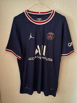 Camiseta PSG talla M - Color azul marino. - Cuello redondo con detalles en rojo y blanco. - Mangas cortas con detalles en rojo y blanco.