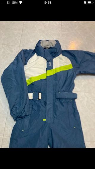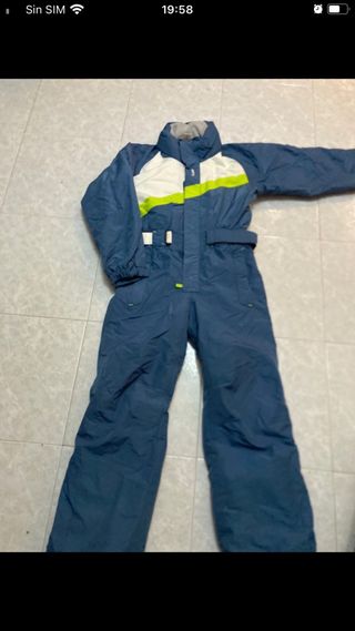 Traje de nieve de la marca Wedze, ideal para niños de 10 a 12 años. Es un mono completo con un diseño moderno y funcional. - Color azul con detalles en blanco y verde lima. - Cremallera frontal. - Cintura ajustable con cinturón. - Puños elásticos en mangas y piernas.