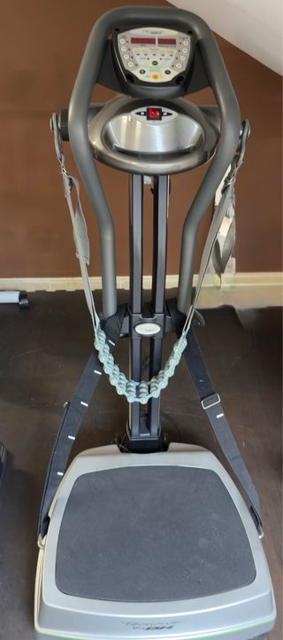 Plataforma vibratoria de la marca BH Tecnorita. - Pantalla digital para tiempo y frecuencia. - Botones de selección de tiempo: 30, 45, 60, 90 segundos. - Botones de selección de frecuencia: 30, 35, 40, 45 Hz. - Programas preestablecidos P1-P5. - Modos manual y programa. - Botones de control de intensidad (+/-). - Botones de inicio y parada.