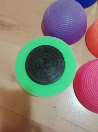 Conjunto de seis piedras de equilibrio de varios colores para trabajar el equilibrio. Ideal para psicomotricidad. Diseño con círculos concéntricos en relieve para mayor agarre.