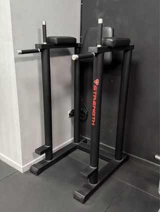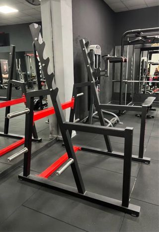 Equipo de gimnasio versátil para entrenamientos. - Estructura robusta de metal negro. - Barras de soporte rojas. - Soportes para discos plateados.