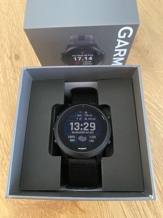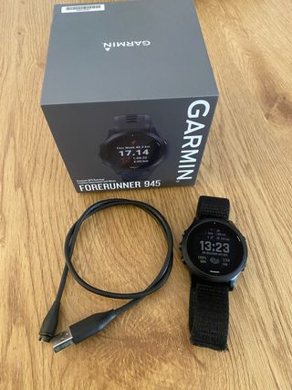 Reloj deportivo Garmin Forerunner 945 en color negro. Incluye cable de carga y caja originales. - Diseño deportivo y moderno ideal para deportes como correr, bicicleta, nadar o triatlón. - Correa de tela negra. - Pantalla a color en perfecto estado. - De regalo banda de pecho frecuencia cardiaca marca coospo que funciona perfectamente. - Se puede negociar.