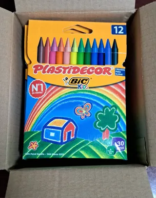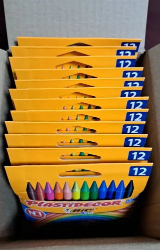 Pack de 12 cajas de ceras Plastidecor de BIC Kids. Cada caja contiene 12 ceras de colores. - Ceras de colores variados. - Marca: BIC Kids. - Modelo: Plastidecor. Tengo 2 cajas por 22€.