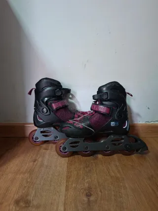Patines en línea de la marca Oxelo, ideales para patinadores que buscan versatilidad. - Talla ajustable de 37 a 40. - Diseño en color negro y morado. - Cierre con velcro y hebilla para un ajuste seguro.