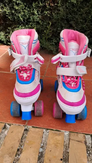 Se venden patines infantiles en buen estado, perfectos para iniciarse en el patinaje. - Diseño en color blanco, rosa y azul. - Cierre de velcro y cordones. - Ruedas de diferentes colores.