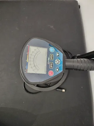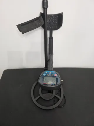Detector de metales con pantalla digital y brazo ajustable. - Mango ergonómico con reposabrazos. - Bobina de búsqueda circular. - Panel de control con botones. - Conector para auriculares.