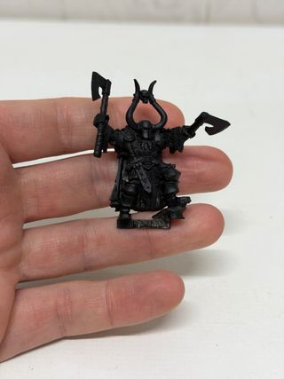 Miniatura de Paladín del Caos de Warhammer, ideal para coleccionistas o juegos de mesa. NO TENGO LA PEANA - Figura detallada de guerrero con armadura. - Incluye dos hachas y casco con cuernos. - Base con inscripciones.