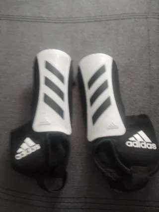 Espinilleras de la marca Adidas. - Diseño con tres franjas. - Color blanco y negro. - Logo de Adidas en la parte frontal y lateral.