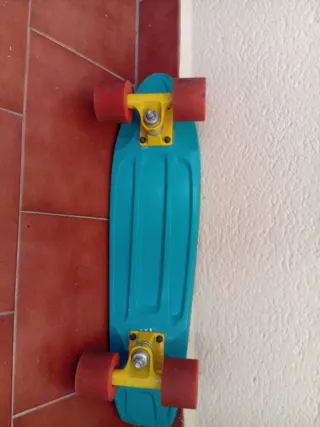 Patinete estilo retro en color azul. - Ruedas de color naranja. - Ejes y soportes de color amarillo.