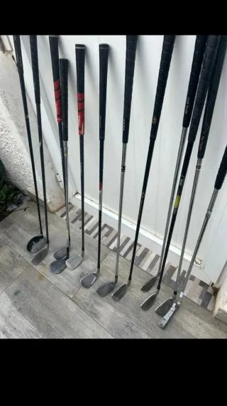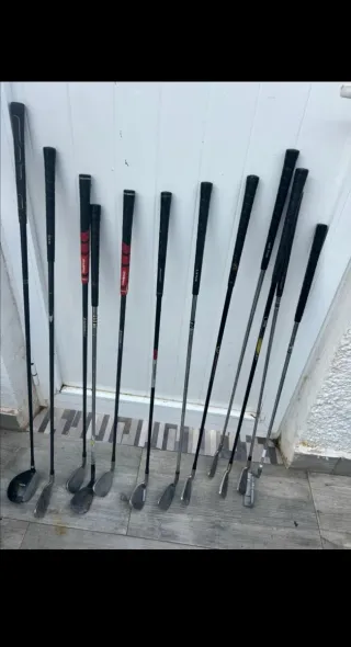 Conjunto de doce palos de golf. - Incluye una variedad de palos para diferentes golpes. - Diseñados para jugadores de golf.