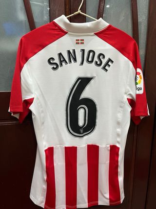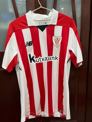 Camiseta de fútbol del Athletic Club, talla L. Diseño a rayas rojas y blancas. Usada por el jugador mikel san jose. - Logo de New Balance. - Escudo del Athletic Club. - Patrocinador Kutxabank.