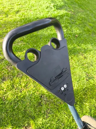 Carrito de golf de tres ruedas en color azul. Es ligero y fácil de maniobrar. Marca Boomerang, tiene uso pero le quedan muchas vueltas que jugar. - Estructura de metal. - Ruedas resistentes.