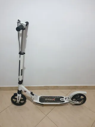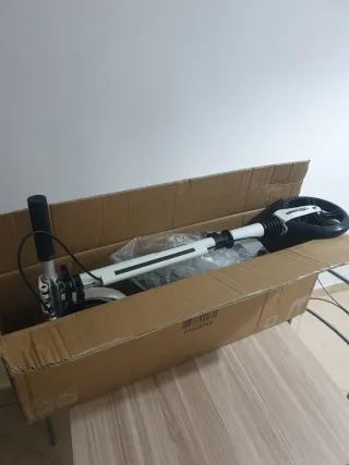 Patinete en su caja original, listo para usar. - Diseño moderno en blanco y negro. - Ruedas grandes para un desplazamiento suave.