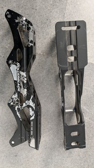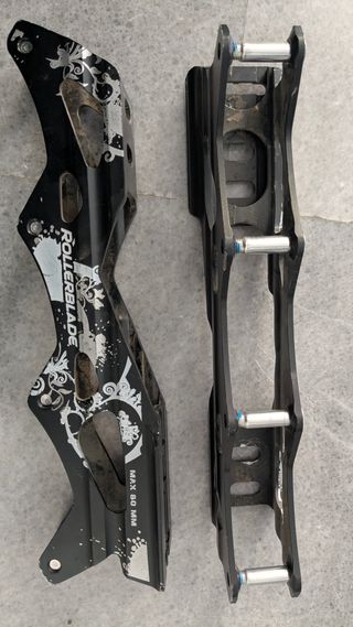Guías de patines Rollerblade Twister 80 de aluminio. Vendo guías originales de patines Rollerblade Twister 80, fabricadas en aluminio extruido, muy rígidas y resistentes. Ideales para patinaje urbano / freeride por su gran estabilidad y transmisión de potencia. Características técnicas: Marca: Rollerblade Modelo: Twister 80 Material: aluminio extruido Configuración: 4 ruedas de hasta 80 mm Distancia entre ejes (aprox.): 243 mm Montaje estándar 165 mm (compatible con muchas botas de freeride) Muy buena rigidez y control para slalom y ciudad Incluyen los tornillos/ejes visibles en las fotos. Estado usado y en buen estado estructural