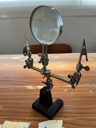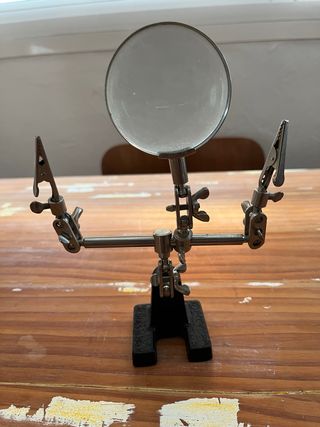 Herramienta versátil para trabajos de precisión y manualidades. Cuenta con una lupa para una mejor visualización y dos pinzas ajustables para sujetar piezas. - Base estable para colocar sobre superficies. - Brazos flexibles y articulados. - Pinzas de cocodrilo para un agarre firme.
