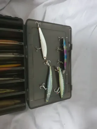 Set de señuelos de pesca variados, listos para tu próxima salida. - Incluye una caja organizadora. - Varios señuelos de diferentes colores y diseños.