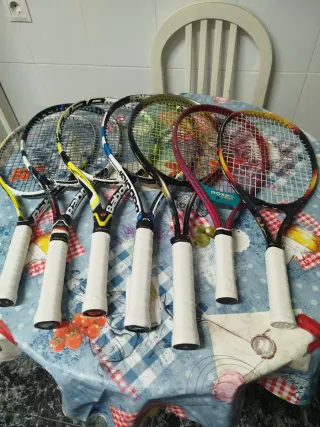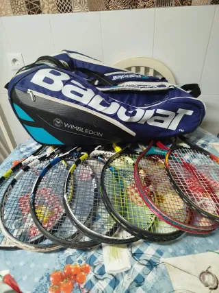 Conjunto de raquetas de tenis Babolat y un raquetero. Se venden 7 raquetas Junior BABOLAT Raquetas usadas con saltos de pintura, protectores raspados, sin golpes, roturas ni grietas. Cuerdas en buen estado. Grips cambiados. Raquetero usado BABOLAT , con todas las cremalleras funcionado perfectamente. - Varias raquetas de tenis. - Incluye raquetero.