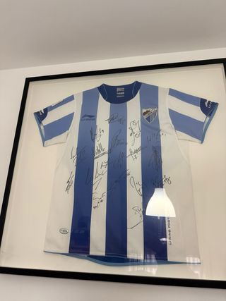 Camiseta del Málaga CF con firmas de los jugadores de la champions como Joaquin, Baptista, Isco, Toulalan,... Se encuentra en muy buen estado, camiseta original sin numero atras. Cuadro con crsital de unos 80 cm por cada lado - Diseño a rayas blancas y azules. - Logo del equipo en el pecho. - Marca Li-Ning.