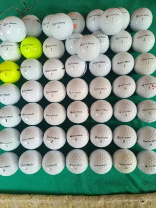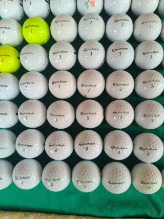 Lote de bolas de 60 bolas golf de la marca TaylorMade. Incluye bolas con diferentes números. - Bolas de golf TaylorMade. - Variedad de números visibles: 0, 1, 2, 3, 5 y 88. En perfecto estado.