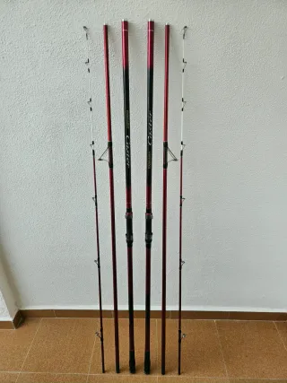 Conjunto de cañas de pesca Daiwa Tournament Evo. - Modelo: 35 425 HBF - Color: Rojo y negro - 2 años de uso, 10 salidas siempre endulzadas con protector zanco. - Ni 1 rasguño, ningún defecto todo como nuevo. - Funda original incluida. Incluye contrapesos originales. - A juego con 2 fliegen que estan en mi perfil..