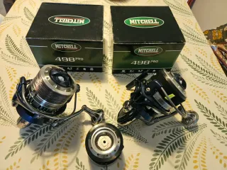 Se vende pareja de carretes de pesca Mitchell 498 Pro. Son ideales para la pesca en barco o para calar. Han ido a pescar 1 vez bueno se puede ver a primera vista estan impecables ningún defecto, incluye cajas originales con papeles y todo. - Modelo: 498 Pro - Marca: Mitchell - Incluye dos unidades. - 1 Bobina extra original Mitchell - Cargados con 700 metroa de hilo Colmic Former del 0.40 las 3 bobinas.
