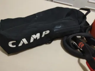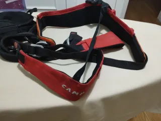 Arnés de escalada de la marca CAMP, diseñado para actividades en montaña. - Color rojo y negro. - Hebillas ajustables. - Incluye bolsa de transporte.