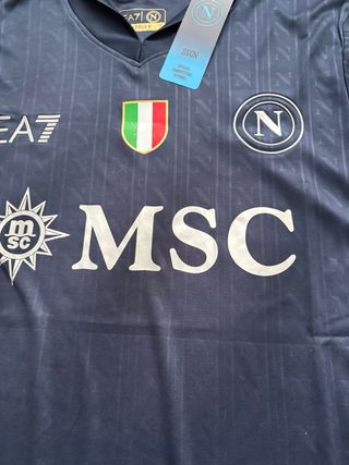 Camiseta de fútbol del Napoli. - Color azul marino. - Logo EA7. - Escudo del equipo. - Patrocinador MSC.