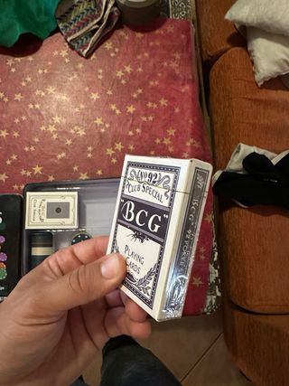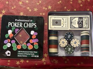 Caja metalica que contiene: - Set de 100 fichas de diversas cantidades. - 2 barajas de cartas nuevas a estrenar. - 1 Dealer Además se regala un tapete, una baraja de cartas y otra baraja española, como se muestran en las imagenes. Precio negociable.