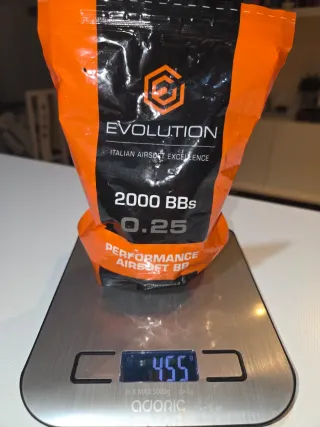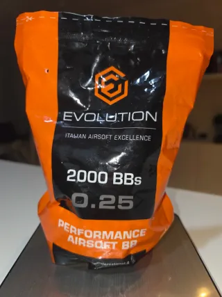 Paquete de bolas de Airsoft de la marca Evolution. - No está completo pero casi, habrá unas 1700 unidades. - Gramaje de 0.25g. - Modelo Performance Airsoft BB.
