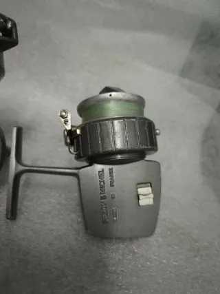 Se vende pareja de antiguos carretes de pesca portugueses - Carrete de color gris con logo sofi C1 - Carrete Rocha de color verde con bobina adicional.