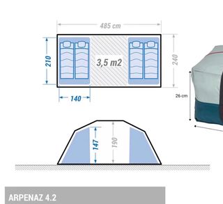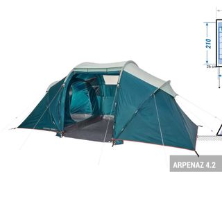 Tienda de campaña Arpenaz Family 4.2 con capacidad para 4 personas. - Dimensiones interiores: 210 cm (ancho) x 485 cm (largo). - Espacio habitable de 3,5 m2. - Altura máxima interior de 190 cm. - Dimensiones plegada: 26 cm. *las varillas de la tienda están todas nuevas, recién cambiadas *se vende por nueva tienda/ furgo