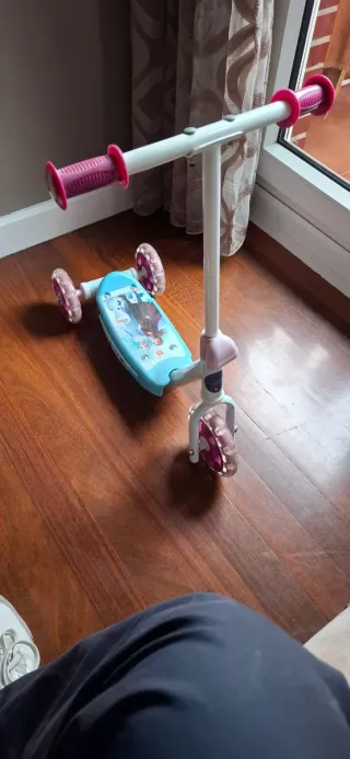 Patinete infantil con diseño de Frozen, ideal para los más pequeños. Cuenta con tres ruedas para mayor estabilidad. - Manillar ajustable en altura. - Ruedas con luces. - Plataforma antideslizante.
