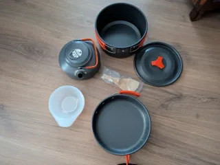 Conjunto de utensilios de cocina para camping, ideal para preparar comidas al aire libre. Incluye varios elementos para cocinar y servir. - Precio en Amazon: 35€ - Olla principal con asas naranjas. - Tapa con asa naranja. - Sartén con asa naranja. - Tetera metálica con asa naranja. - Un cuenco blanco.