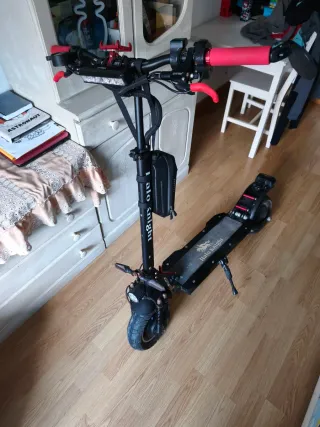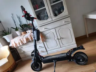 Patinete eléctrico HaloKnight T104 en buen estado, con 3000km de uso. Incluye su cargador, suspensión hidráulica y la de serie de repuesto, casco, para de cabra nueva a estrenar además de la instalada, manillar nuevo, entrego el de serie también, luces extra delantera y trasera y limitador de velocidad para su instalación. Autonomía+50km - Manillar con puños rojos. - Luces delanteras y traseras. - Ruedas anchas para mayor estabilidad. - Frenos de disco