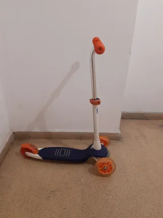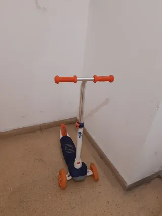 Patinete de tres ruedas diseñado para niños de 2 a 5 años (hasta 20 kg). Desmontable y plegable. - Tres ruedas para mayor estabilidad. - Puños naranjas para un agarre cómodo. - Plataforma ancha para los pies.