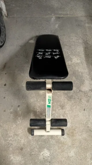 Banco para ejercicios de abdominales, ideal para entrenar en casa. Su diseño permite guardarlo fácilmente. - Tapicería negra. - Estructura blanca. - Incluye instrucciones gráficas de ejercicios.Tiene marcas de gato en una zona puntual