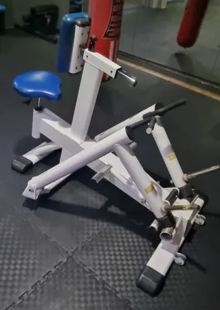 Máquina de remo sentada de la marca Telju, diseñada para usar con discos. - Estructura metálica blanca. - Asiento azul.
