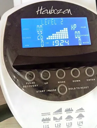 Bicicleta elíptica Heubozen Fahrenheit 2.0. Heubozen es una marca francesa de fitness de primera gama. Elíptica profesional usada ocasionalmente en el hogar, en perfecto estado, está totalmente nueva, conserva incluso el plástico protector de la pantalla digital y los controles. Medidas: Alto: 168 cm Largo: 125 cm Ancho de la base: 65 cm Ancho de los manillar/mástiles 68 cm