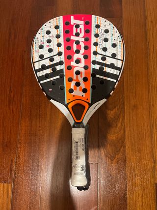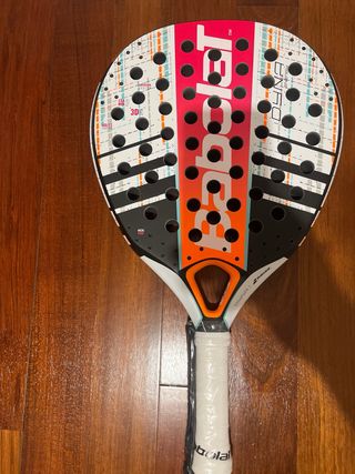 Pala de pádel Babolat Dyna Energy con un diseño moderno y llamativo. A estrenar porque me toco en un sorteo. - Superficie blanca con detalles en naranja, rosa y negro. - Agarre blanco con etiqueta. - Agujeros en la cara de la pala.