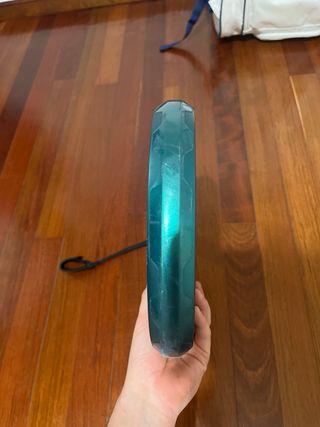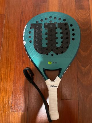 Paleta de pádel Wilson Blade Pro 3. Se vende porque no me adapto a ella. Tendrá unos 10 partidos Se escuchan posibles cambios - Diseño en color verde azulado. - Logo grande de Wilson en negro. - Agarre blanco. - Correa de seguridad negra.
