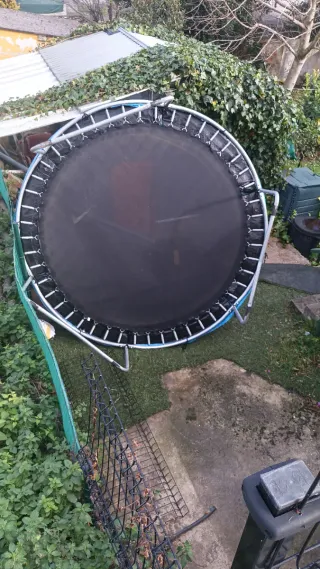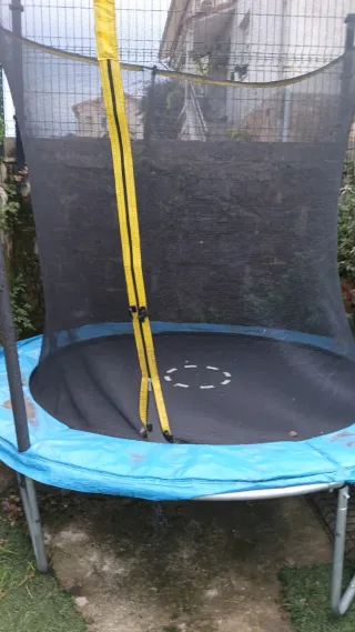 Cama elástica para que los niños disfruten saltando en el jardín. Cuenta con una red de seguridad para mayor protección. - Estructura metálica. - Red de seguridad. - Tapiz de salto negro. - Protector de borde azul. Muy poco uso , perfecto estado . Se entrega recién limpiada ya que las manchas que se ven en ñ colchoneta de protección es de estar como es lógico a la intemperie. sobre 2,5 metros de ancho. Posibilidad de verla montada. se vende por falta de uso y espacio